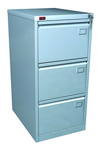 Шкаф картотечный металлический (картотека) сборно-разборный. Предназначен для хранения документов в формате P FoolScap и А4. Имеет три выдвижных ящика. Благодаря телескопическим направляющим каждый ящик может быть выдвинут полностью на всю глубину. Металлическая картотека КР-3 имеет центральный врезной замок и антиопрокидывающее устройство. Покрытие — полимерное порошковое светло-серого цвета (RAL 7035). В стандартную комплектацию картотечного шкафа КР-3 входит врезной замок.