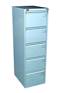 Шкаф картотечный металлический (картотека) сборно-разборный. Предназначен для хранения документов в формате P FoolScap и А4. Имеет пять выдвижных ящиков. Благодаря телескопическим направляющим каждый ящик может быть выдвинут полностью на всю глубину. Металлическая картотека КР-5 имеет центральный врезной замок и антиопрокидывающее устройство. Покрытие — полимерное порошковое светло-серого цвета (RAL 7035). В стандартную комплектацию картотечного шкафа КР-5 входит врезной замок.