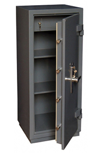 Офисный металлический шкаф, повышенной устойчивости ко взлому, КЗ — 065 Т представляет собой сварную металлическую конструкцию и состоит из наружного и внутреннего корпусов, пространство между которыми заполнено инертным материалом. Шкаф оборудован запорным механизмом, который блокируется замком CAWI, производство Германии. Запорный механизм приводится в действие при помощи ручки.