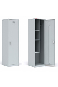 Шкаф металлический разборный двухсекционный, предназначен для хранения сменной одежды и инвентаря. В стандартную комплектацию каждого шкафа входят триполки, перекладина для вешалки и крючки для одежды. Шкаф оснащен врезным замком.
