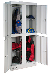 Металлический сушильный шкаф ШСО-2000-4 используется для сушки влажной, а также мокрой одежды и обуви. Основной особенностью данной модели сушильных шкафов является наличие 4 независимых отделений, каждое из которых запирается отдельным замком. Внутри шкафа находятся съёмные сетчатые полки, которые дают возможность оптимально использовать пространство шкафа, например, сушить одежду различной длины. Модель ШСО-2000-4 оборудована специальным фланцем, через который шкаф можно подключить к вытяжке.